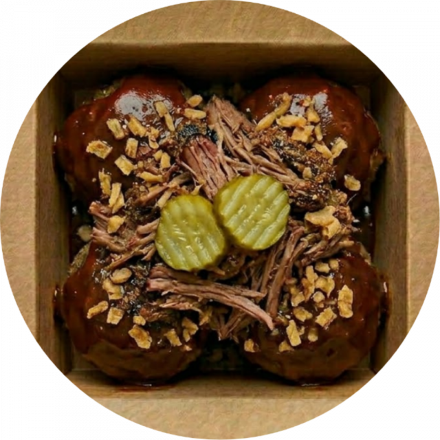 Smoky barbecue sauce topped with dry rubbed pulled beef brisket, crispy fried onions and sweet pickles.