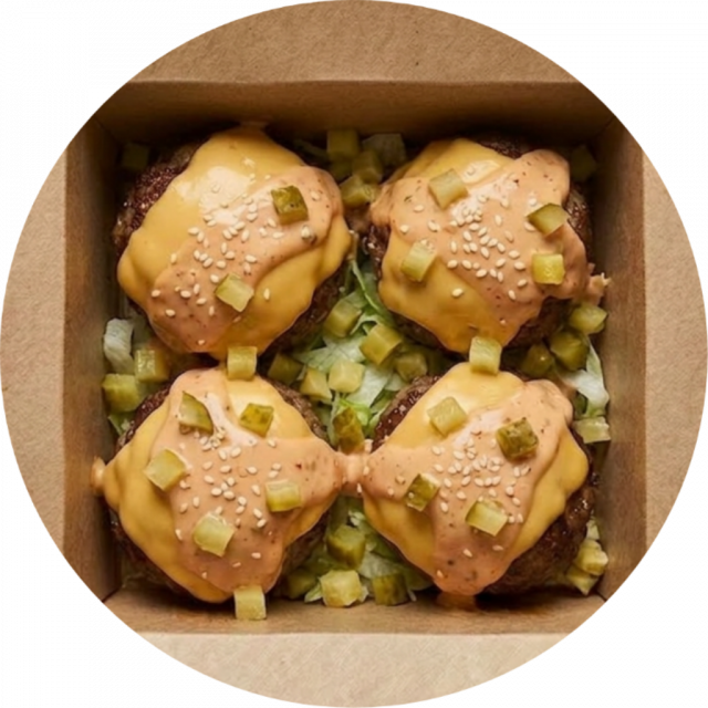Our take on a Big burger from you know where. Lettuce, cheese, burger sauce, pickles and sesame seeds.